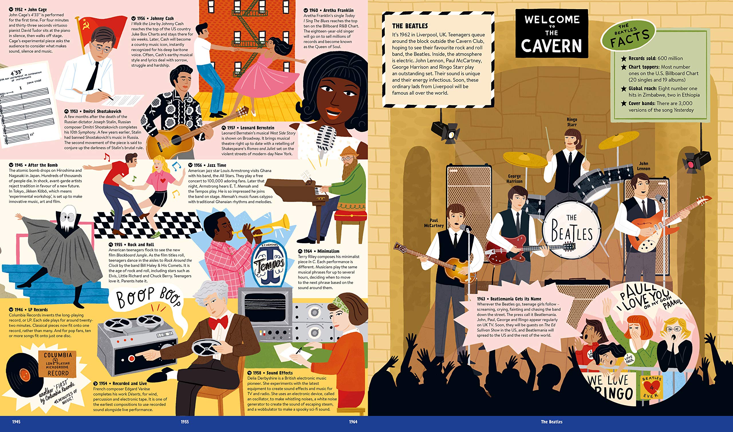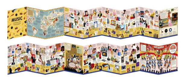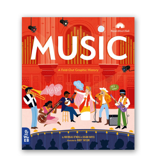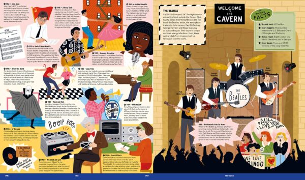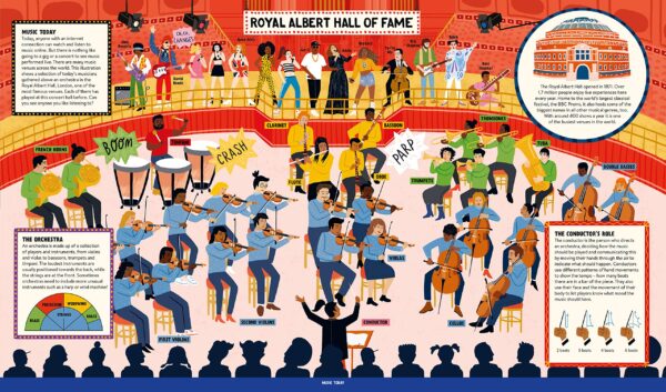 Learn about how different genres started – including classical, folk, jazz, gospel, rock ‘n’ roll, country, punk, grunge and pop. Discover the stories of maestros including Beethoven, Wei Liangfu, Django Reinhardt, The Beatles, Joni Mitchell, David Bowie, Maria Callas, Nina Simone, Louis Armstrong and Beyonce. Marvel at the orchestra with a huge illustration set in the Royal Albert Hall, and find out about ancient instruments from all over the world.