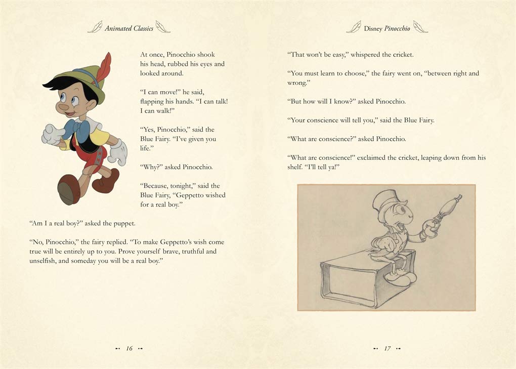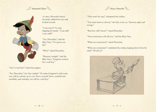 Ages 8 - 9This beautiful hardback features premium cloth binding, a ribbon marker to match the cover, foil stamping and illustrated endpapers, making this the perfect gift for all those who have been enchanted by the magic of Pinocchio and a book to be treasured by all. A family favourite for eighty years, Disney Pinocchio is one of the best-loved films of all time. Relive the magic through this retelling of the classic animated film, accompanied by paintings, story sketches and concept art from the original Disney Studio artists.