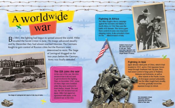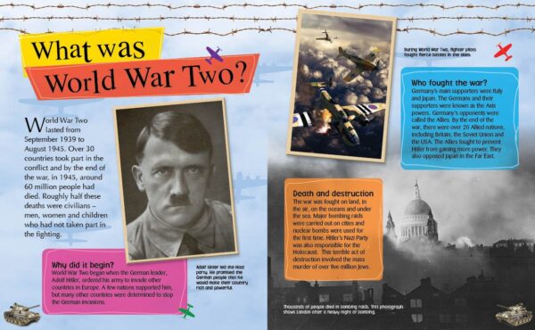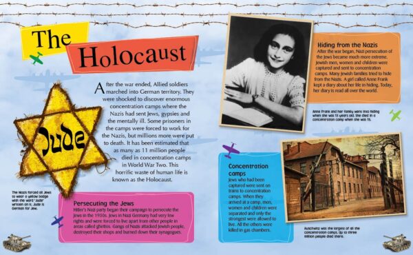 Ages 9 - 11This photographic book gives you an overview of World War Two. From how the war began to how it spread worldwide, the new technology that was used in war for the first time, how women’s roles changed in society because of the war, what life was like on the home front, and how the war was recorded in pictures, diaries, poems and stories. You can learn about key figures, such as Winston Churchill, and events, such as The Holocaust.