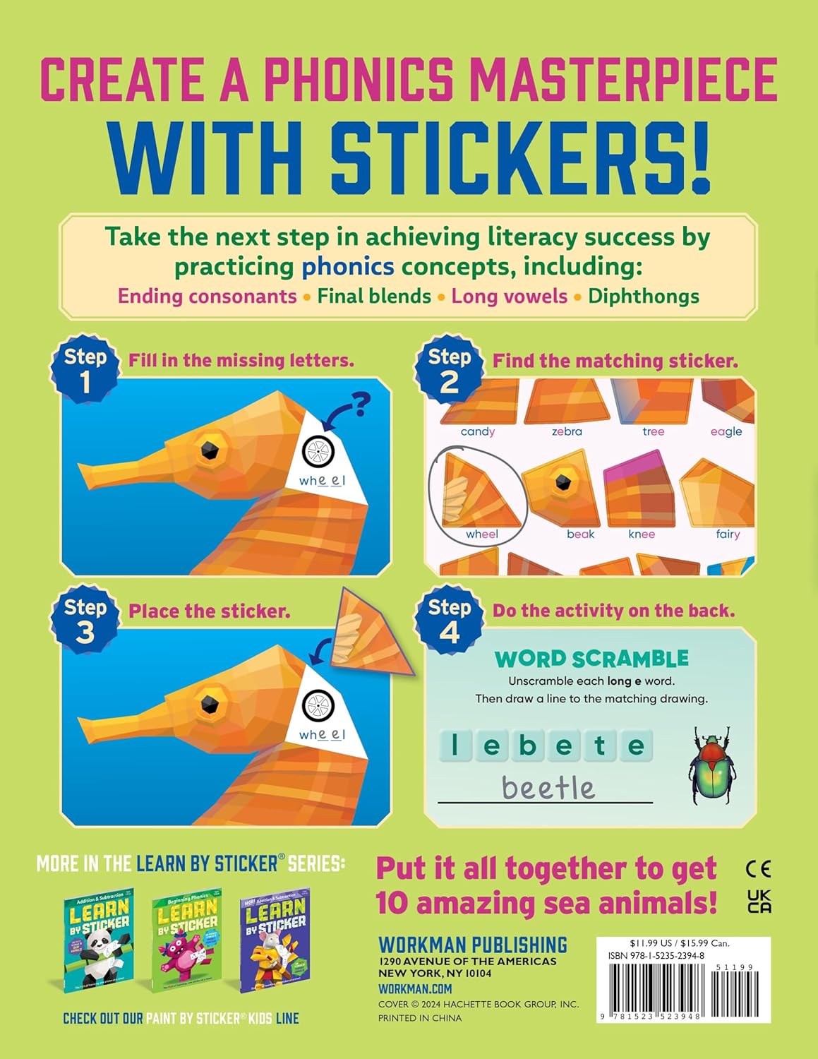 On the back of each sticker page, kids extend their learning with fun, phonics-related, critical thinking activities like decoding secret messages, unscrambling words, solving crosswords, and more.