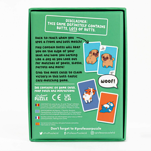 May Contain Butts will keep you on the edge of your seat and have you barking like a dog as you look out for matches of goats, sloths, parrots and more! Grab the most cards to claim victory in this butt-tastic card-matching game.