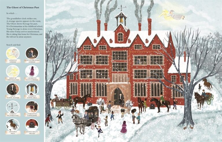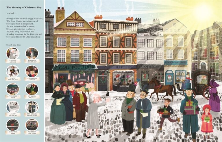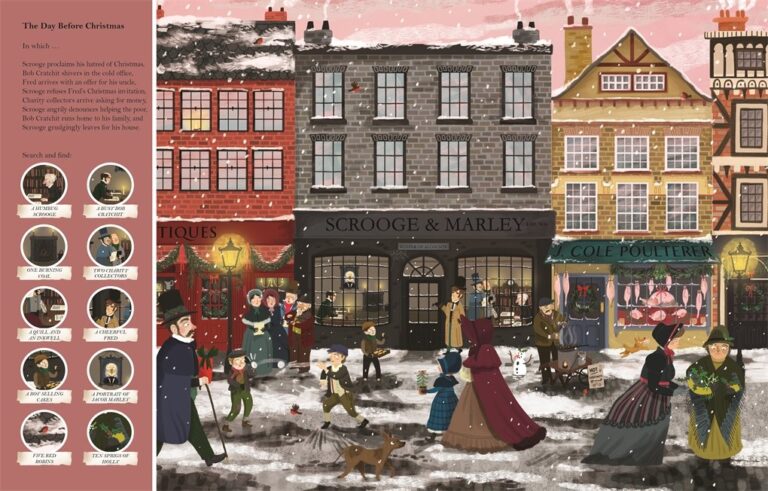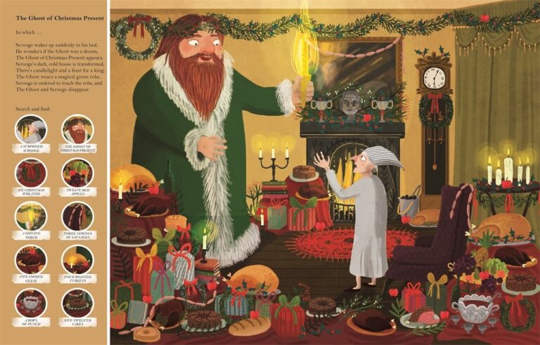 Discover the world of Charles Dickens with Search & Find A Christmas Carol. The popular, magical story is retold in beautifully illustrated search & find pages where you can find the characters on the busy pages and follow them through the story. Each page is full of characters to find and details to spot in the busy scenes, such as Scrooge in his counting house, the arrival of Jacob Marley’s ghost, the Fezziwig Christmas party and the Cratchit family at home on Christmas Day and many more.