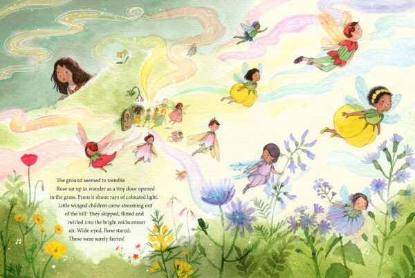 One Midsummer’s Day, walking wearily home, Rose hears beautiful singing and follows the joyful sound deep into the trees. As she listens, a flurry of fairies bursts out of a tiny door in the side of a hill! One of the fairies invites Rose to join their party.