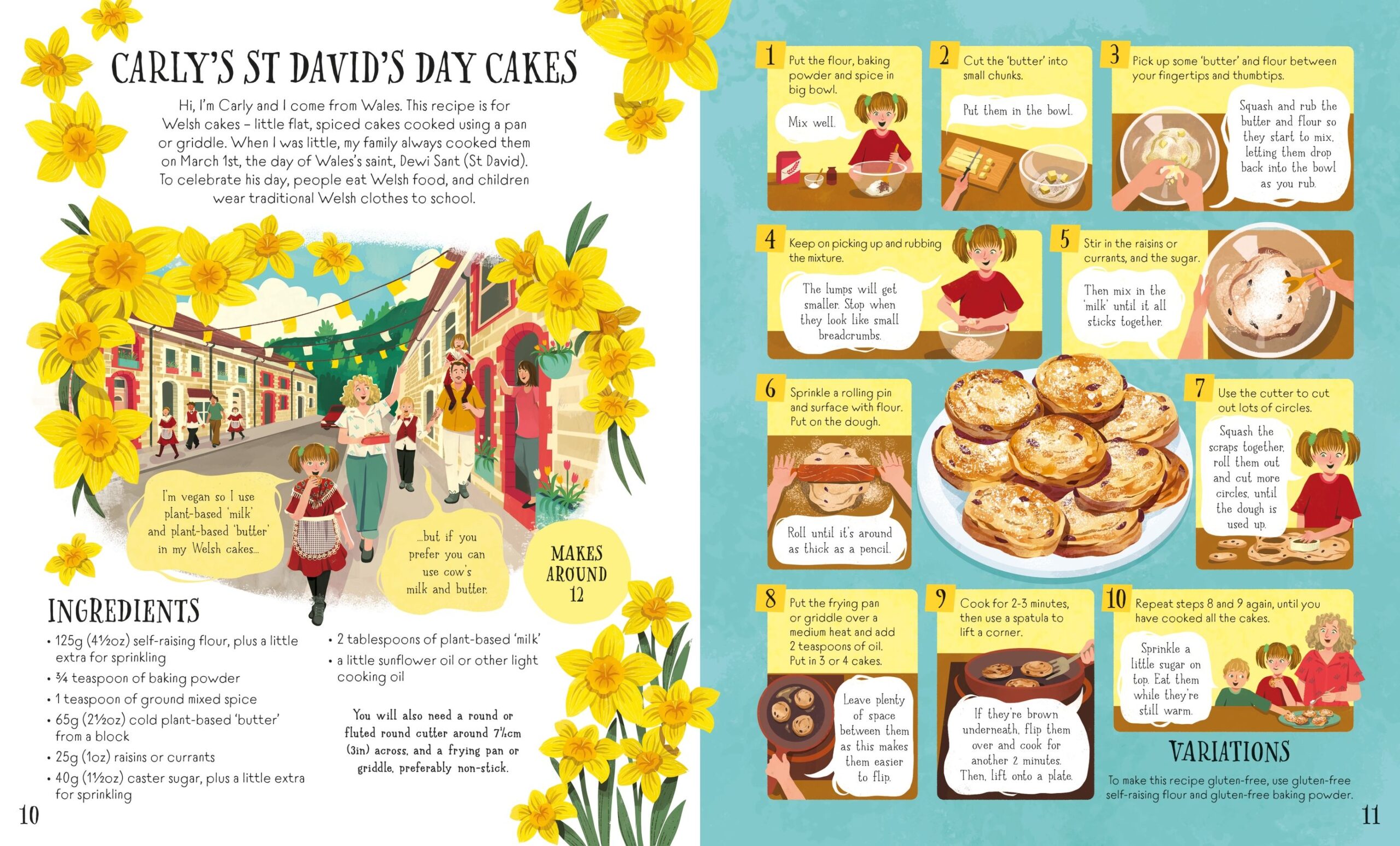 All the recipes are vegetarian, and instructions are also included to make them vegan, nut-free, dairy-free, egg-free and gluten-free – or any combination of these. Celebrations featured include: St David’s Day (Wales); Halloween (USA); birthday (Italy); Passover (Jewish diaspora); Twelfth Night (France); family time (Sudan); Girls’ Day (Japan); Barbados Day (Barbados); Christmas Eve (Germany); Day of the Dead (Mexico); Palm Sunday (Spain); Lunar New Year (South Korea); ANZAC Day (New Zealand); pool party (Brazil); Rice Festival (Indonesia); Shrovetide (Finland); Thanksgiving (Canada); Ramadan (Bangladesh); wedding (Guyana); party (Nigeria); New Year (Bulgaria)